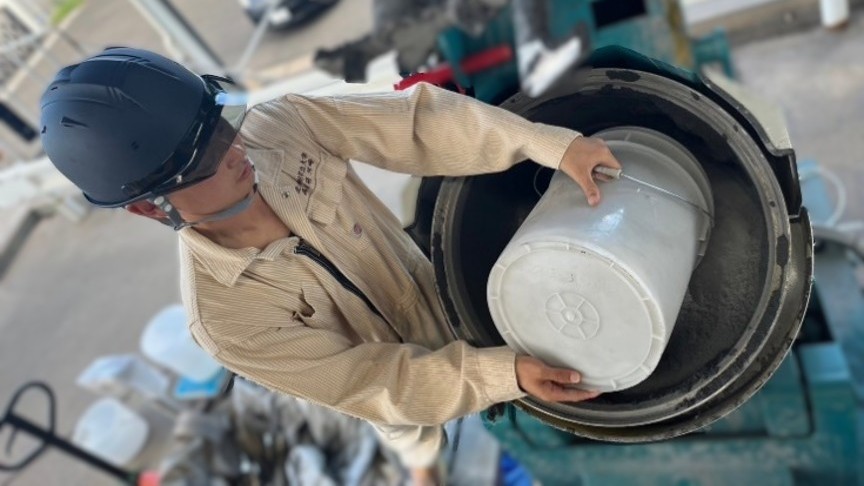 少量のフライアッシュであれば、より効率の良いジューサーミキサーを使用していましたが、実機化には不向きでした。
